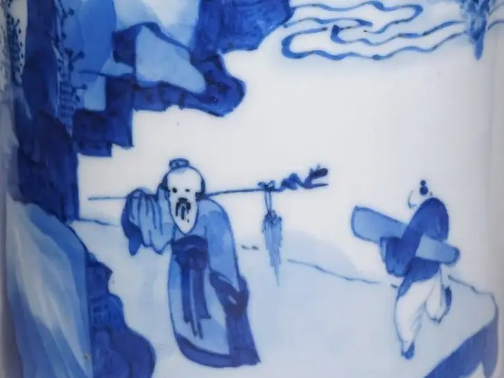 当时采用含钴元素的青料,在画于瓷胎,后罩透明釉,高温窑炉中烧制而成。